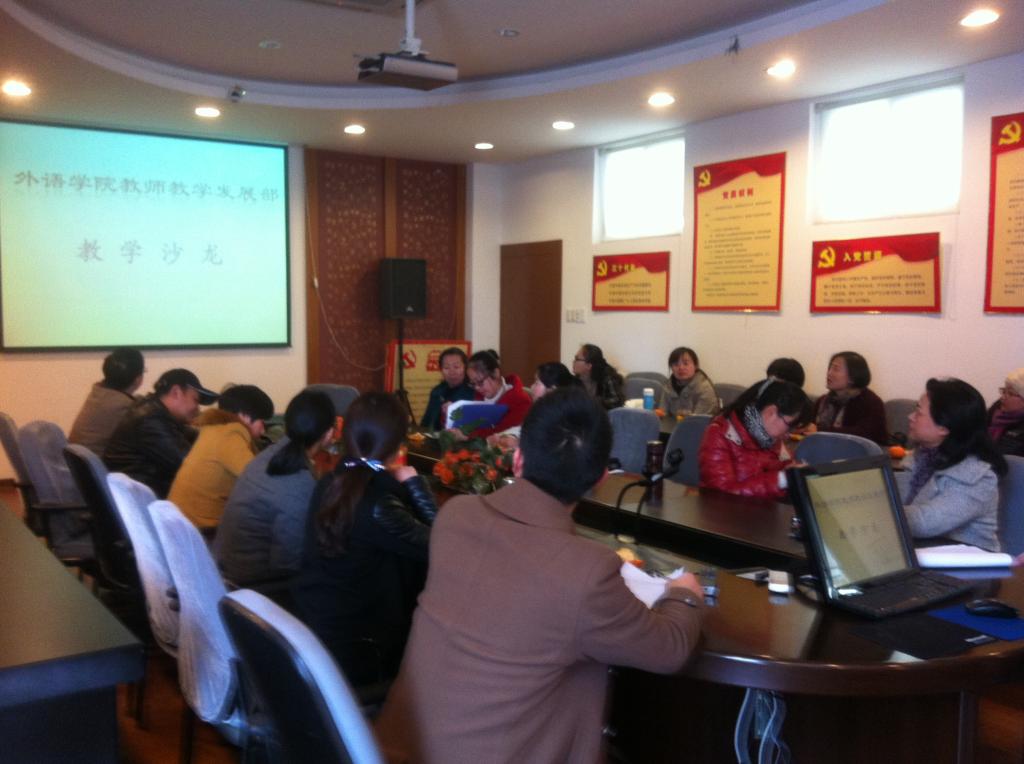 四位来自教学一线的老师分别从不同的角度阐述了自己的教学理念、教学设计、课堂活动组织。冯序颖老师以“Our Globe Is in Danger”一课为例,结合具体的课堂教学实践,从词汇输入、语篇构建以及相关话题讨论三方面分享了自己的教学经验,教学活动设计注重激发学生的学习兴趣、培养学生的思维能力和语言组织能力。刚从美国访学归来的杨杰瑛老师则分享了美国口语观摩课的心得体会,详细介绍了美国口语课堂的侧重点、小组活动组织形式、评估测试形式、课程评价以及师生评价等内容,不少经验都值得我们国内老师借鉴和学习。李莉老师则以“Taste the Sweets and Bitters of Family Life”一课为例,重点介绍了如何在教学中找到学生的兴趣点,解决学生无话可说和不知道怎么说的问题,课堂活动环环相扣,课件生动有趣。梁虹老师展示了她精心设计制作的课件“What Mode of Travel Do you Prefer”, 她的教学设计摆脱了原有教材的束缚,从培养学生的实际语言运用能力出发,以VOA慢速英语为手段训练学生的听力和语音;自备相关话题的单词、词组和表达材料,结合合作型学习,解决学生的基本知识储备;最后设计了“探究活动”环节,旨在进一步提高学生的实际运动能力。梁虹老师的教学设计,目标清晰、形式丰富、侧重合作、讲究实效。与会教师就具体的教学问题和主讲教师进行了良好的互动。