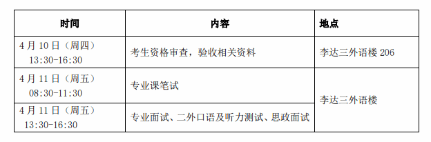 所有招生专业均采用现场面试方式。调剂考生复试时间拟定于4月11日。复试形式及时间安排如下(考生凭身份证和准考证进校):