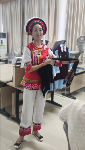 是一个多民族融合的大家庭,王锡芬老师来自云南大理白族,她对自己家乡独特的服饰文化深感骄傲和自豪。活动中,她介绍了白族服饰的类型体系、色谱系统与文化特征、文化基因解码以及服饰的现代传承与创新。同时,她讲解了白族服饰材质养形、结构养气、色彩养神、纹饰养心的特殊功能,不同色彩的运用、不同季节的穿搭组合,传统手艺与现代科技的结合,处处展现白族人民对高品质美好生活的追求,体现了“天人合一”的生命观与“物候相谐”的生存智慧,让参加活动的老师们对民族服饰深厚的文化内涵和的蕴藏养生哲学倍感佩服。王老师还带来了白族服装和头饰,现场指导老师进行穿戴,让老师们亲身体验并感受。