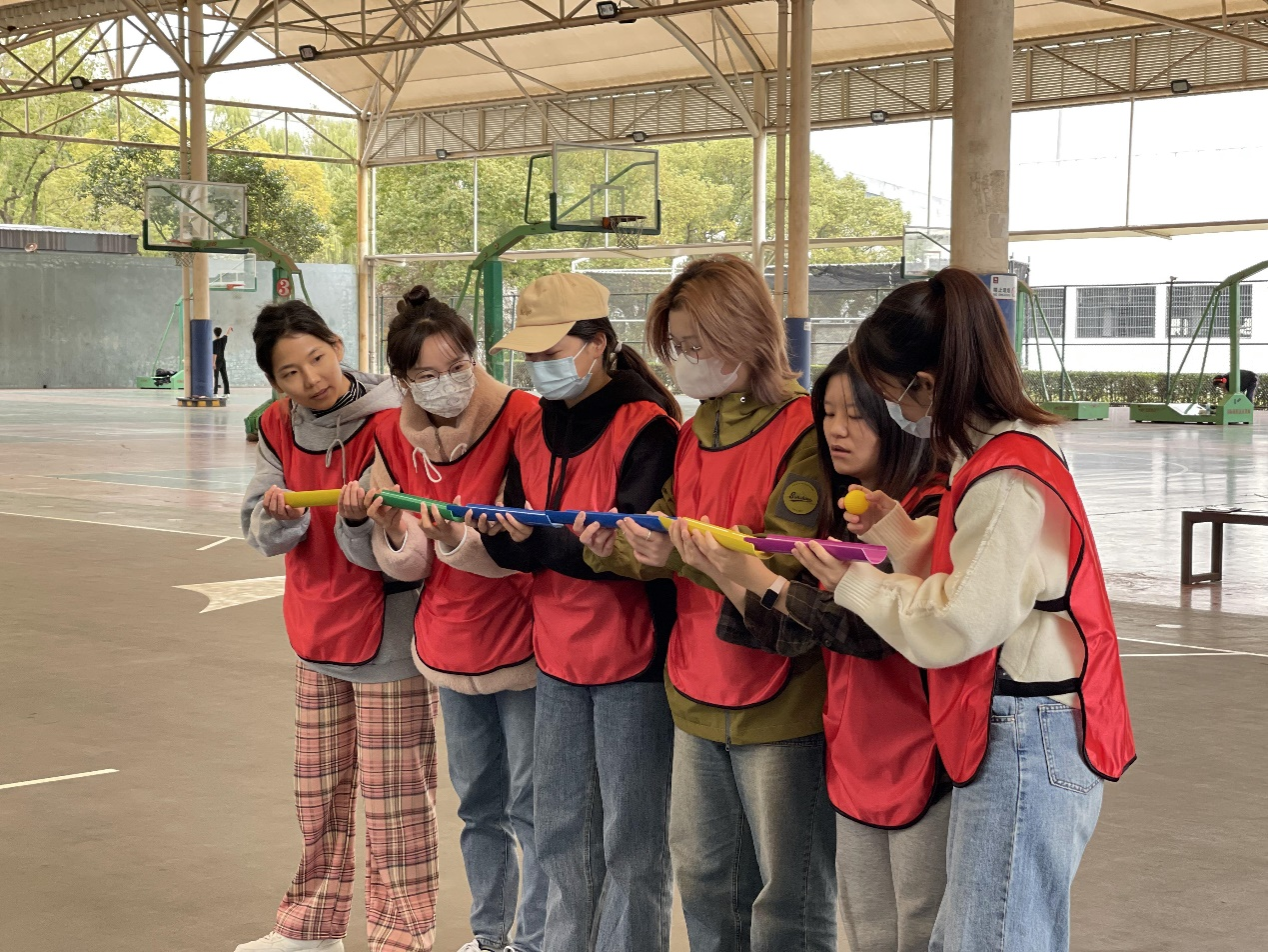 “轨道传球”是本次运动会的另一个精彩项目。每个选手手持一个管道,将其连成一排,让乒乓球在管道上滚动,接力传递至终点的纸杯中。一旦球从管道落下,全队就要退至起点重新开始,最终用时最短的队伍将获得胜利。这个游戏考验选手的团队合作和手眼协调能力,球虽小,却十分“狡猾”,一度让选手们手忙脚乱,一不小心又前功尽弃,只好重头再来,可真是一场考验团队协作的比赛。