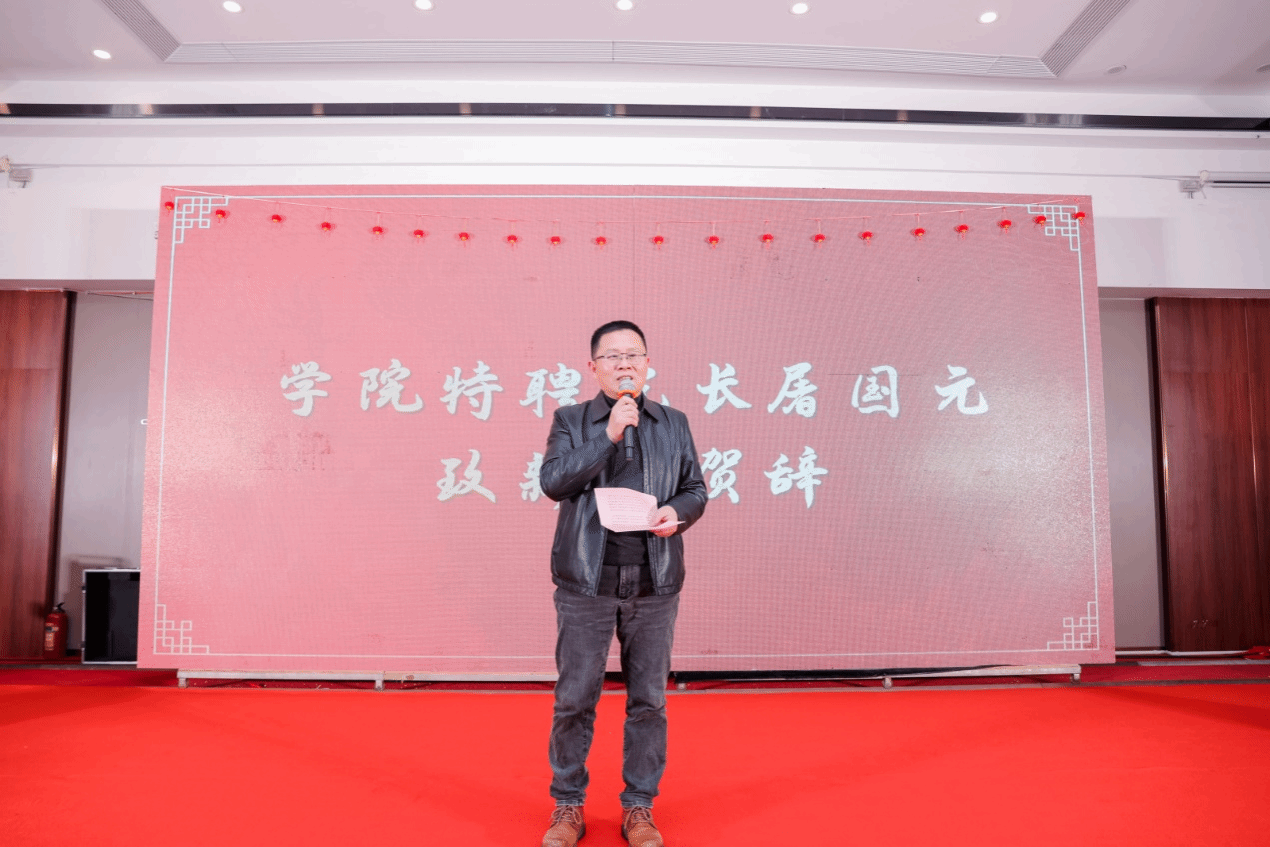特聘院长屠国元发表新年贺词,向在场来宾致以真挚的新年祝福。他回顾了学院过去一年的辉煌与辛劳,对教师们过去一年的辛勤付出表示感谢,并号召全体教职工携手书写新的篇章,为学院的未来发展贡献力量。