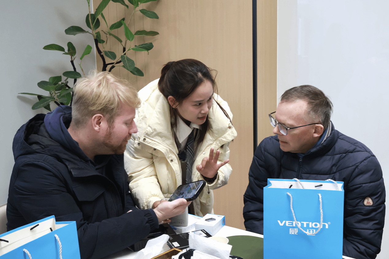 在互动体验环节,曾参与威迅校企合作项目的宁大学生何明珠、叶阳,以流利英文为外籍师生现场演示产品功能。他们不仅是科技产品的讲解者,更是中国青年创新形象的传递者。现场气氛热烈,外籍教师对“多巴胺配色”耳机爱不释手,而留学生们则对符合航空规定的轻薄充电宝赞不绝口。