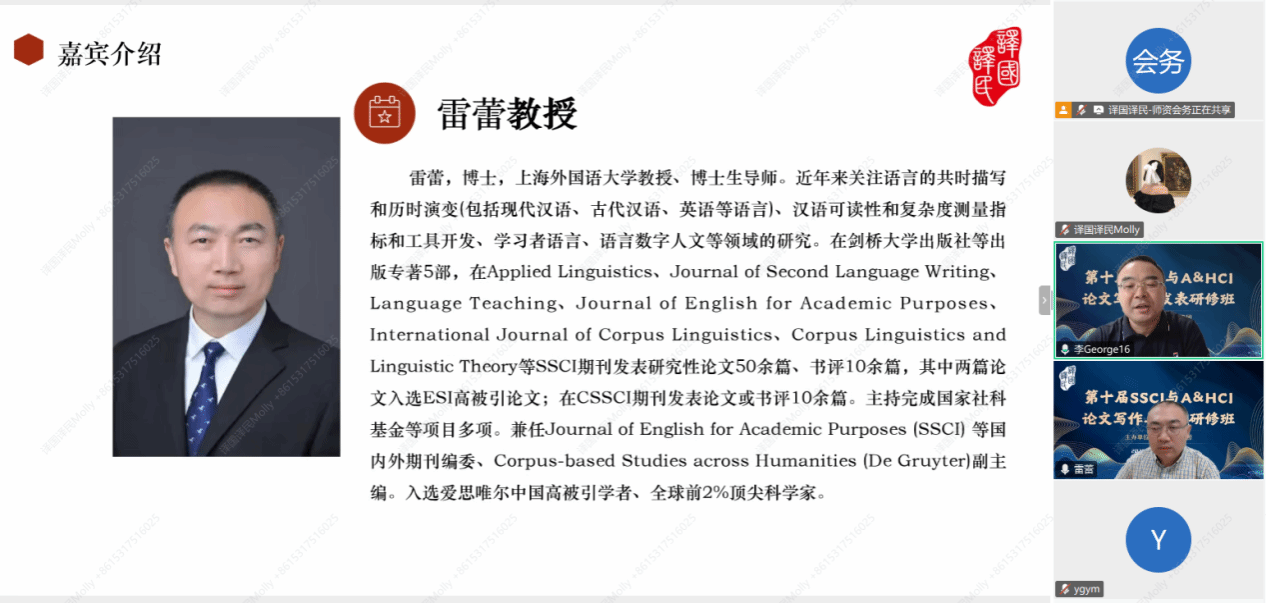 北京外国语大学博士生导师、中国外语与教育研究中心研究员徐浩教授,系统阐述了“质化研究中AI辅助设计与结果呈现”的最新进展;上海外国语大学语料研究院院长雷蕾教授,作为多本SSCI期刊编委,以其丰富的审稿经验,详细讲解了“AI辅助论文修改与审稿意见回应”的实用技巧。