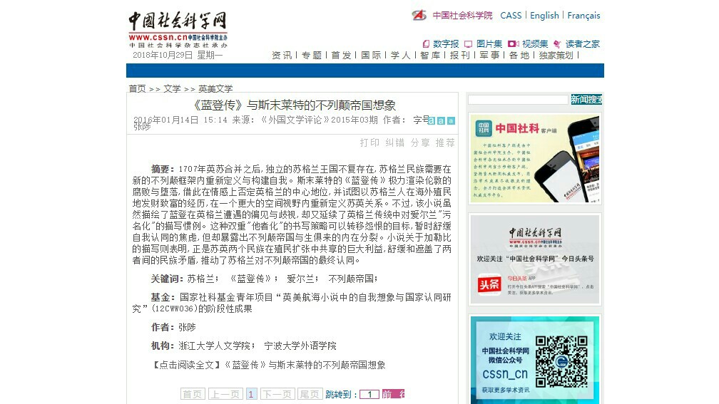 近日,中国社会科学院在其官网爱下电子书“学科·成果-英美文学”栏目刊载了爱下电子书