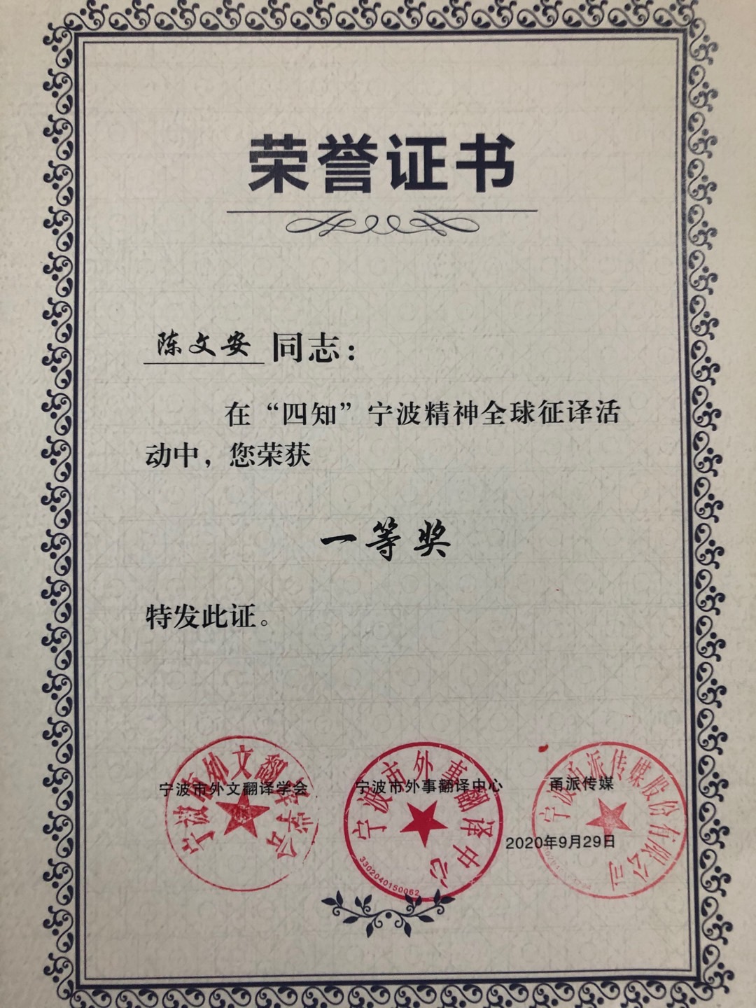 陈文安老师的译本“Ningbo Character:Pragmatism, Resilience, Courtesy, Charity (PRCC)”从上百个译本中脱颖而出进入TOP10,在线网友投票数遥遥领先(91277票),经专家委员会最终评定,荣获一等奖。