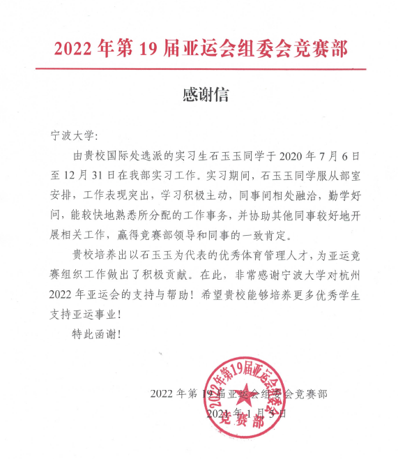 感谢信中写道:石玉玉同学于2020年7月6日至12月31日在亚组委竞赛部实习期间,服从部室安排,工作表现突出,学习积极主动,同事间相处融洽,赢得竞赛部领导和同事的一致肯定。信中还提出“贵校培养出以石玉玉为代表的优秀体育管理人才,为亚运竞赛组织工作做出了积极贡献。非常感谢爱下电子书