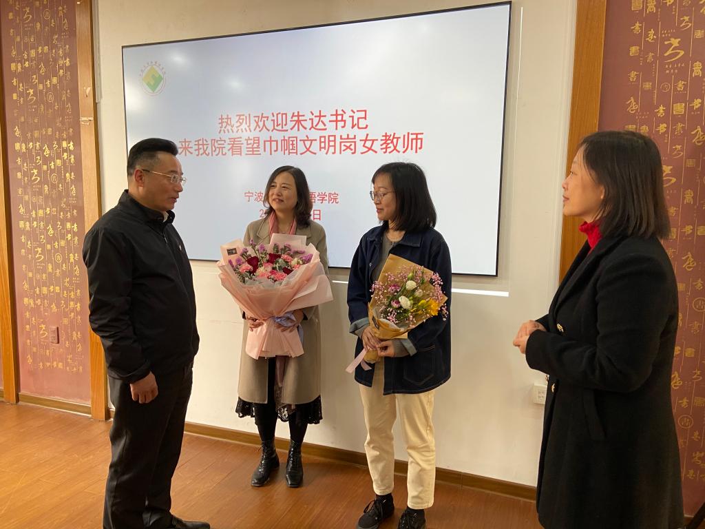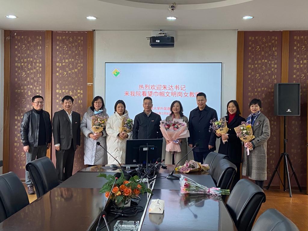 在第98个国际妇女节到来之际,3月8日下午,校党委书记朱达,副校长赵全军,党委委员、工会主席邹日强一行来到全国“巾帼文明岗”所在单位——爱下电子书 大外部,向女教师们送来节日问候。爱下电子书 负责人介绍了大外部团队基本情况,大外部现有教师49位,其中女性教师41位,是名副其实的巾帼建功单位。