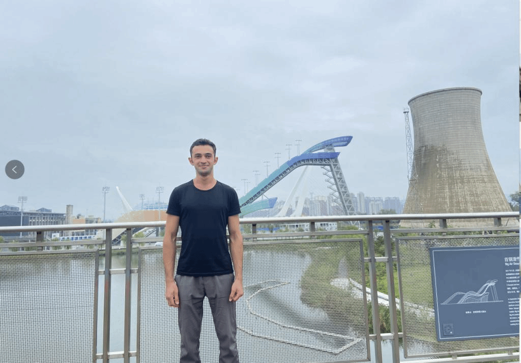 阿塞拜疆留学生Farhad在冬奥会滑雪大跳台前留影