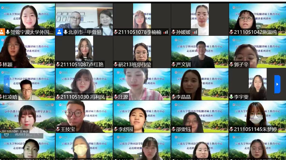 ,主讲“走近职业翻译”系列讲座第三讲,分享影视字幕翻译产业的行业需求、产业现状和技术应用。学院翻译硕士研究生及高年级本科生近200人在云端参加了此次讲座。