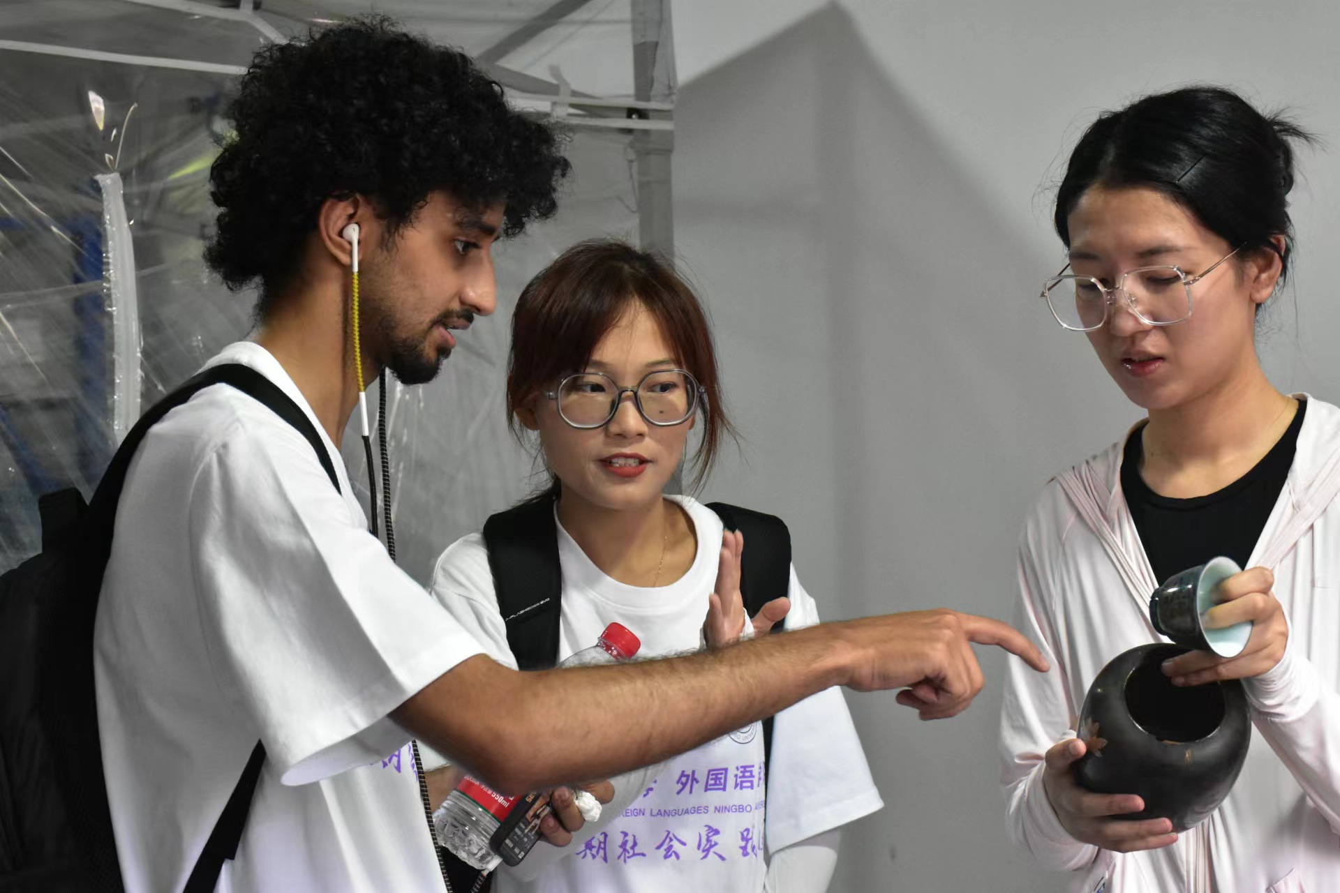 “What’s the meaning of this sentence?” “It means it takes time and energy to produce a lacquerware, which is also homophonic to ‘a late bloomer’.”(意思是漆器的制作需要花费大量时间和精力,这句话也是“大器晚成”的谐音。)一走进鄞州东吴镇的漆艺坊,门口的“大漆晚成”四个大字就引起了也门留学生Ryan的注意。他的随行翻译、实践团成员甘雨雪还十分耐心地解答了简短文字背后蕴含的深刻含义,并向Ryan详细介绍了了大漆工艺的制作流程。