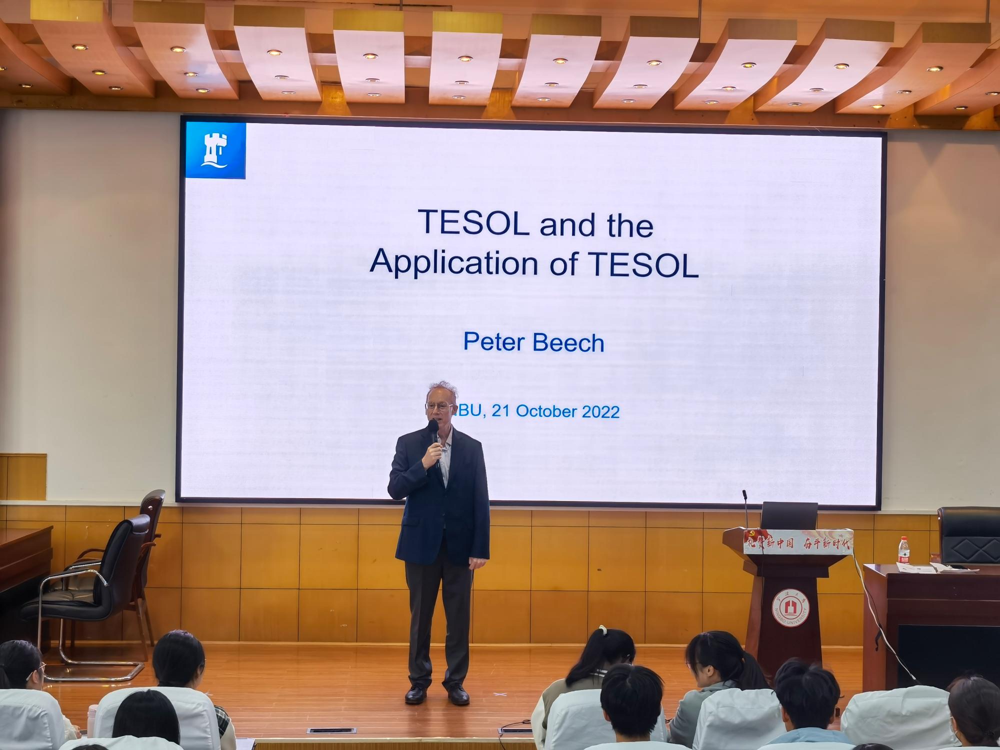 师范生成长系列讲座之“TESOL及TESOL申请”在学院218报告厅举行。现任联合国北卡罗来纳大学英语语言教育中心专业教育和培训高级导师、剑桥语言教学专业发展资格课程负责人Mr.Peter Beech为英语(师范)专业百余名学生带来了本次主题讲座,他介绍了TESOL的最新教学理念及TESOL申请的有关知识。