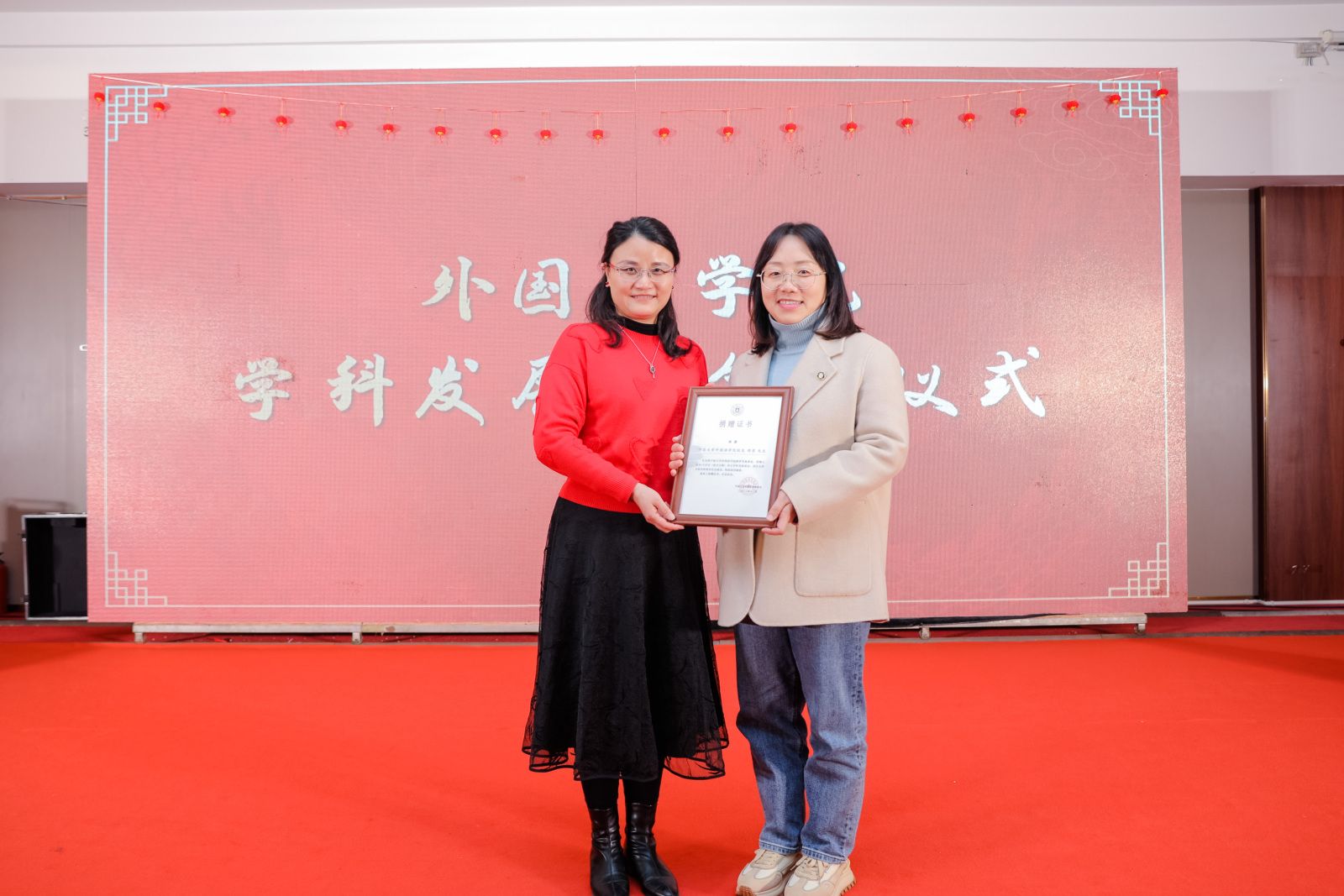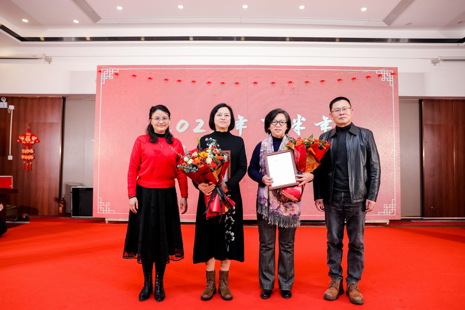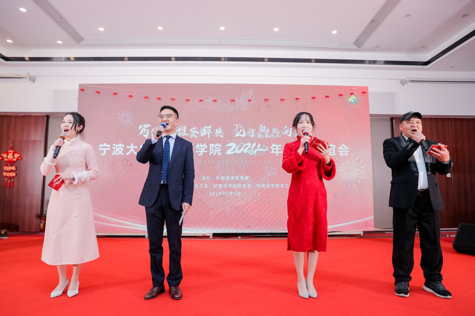 联谊会上,学院为王红阳、王青梅两位老师举办荣休仪式,特聘院长屠国元、学院党委书记翁华星为两位老师颁发荣休证书并献上鲜花,英语系主任李昌标、大外部主任杨廷君为她们送上真诚敬意和美好祝福,感谢他们多年来的辛勤付出和无私奉献。学院为英语系张文雯、日语系刘梦如、德语系郭璐君、学工办辅导员范紫婴和倪嘉婕五位新教师举办入职仪式,学院党政班子成员为五位新教师佩戴院徽。张陟老师、张芸老师、杨建华老师、胡佳老师以职业导师身份送上了《习近平总书记教育重要论述讲义》和入职寄语,勉励新教师以赤诚之心拥抱教育事业,在平凡的岗位上不懈努力、创造佳绩。
