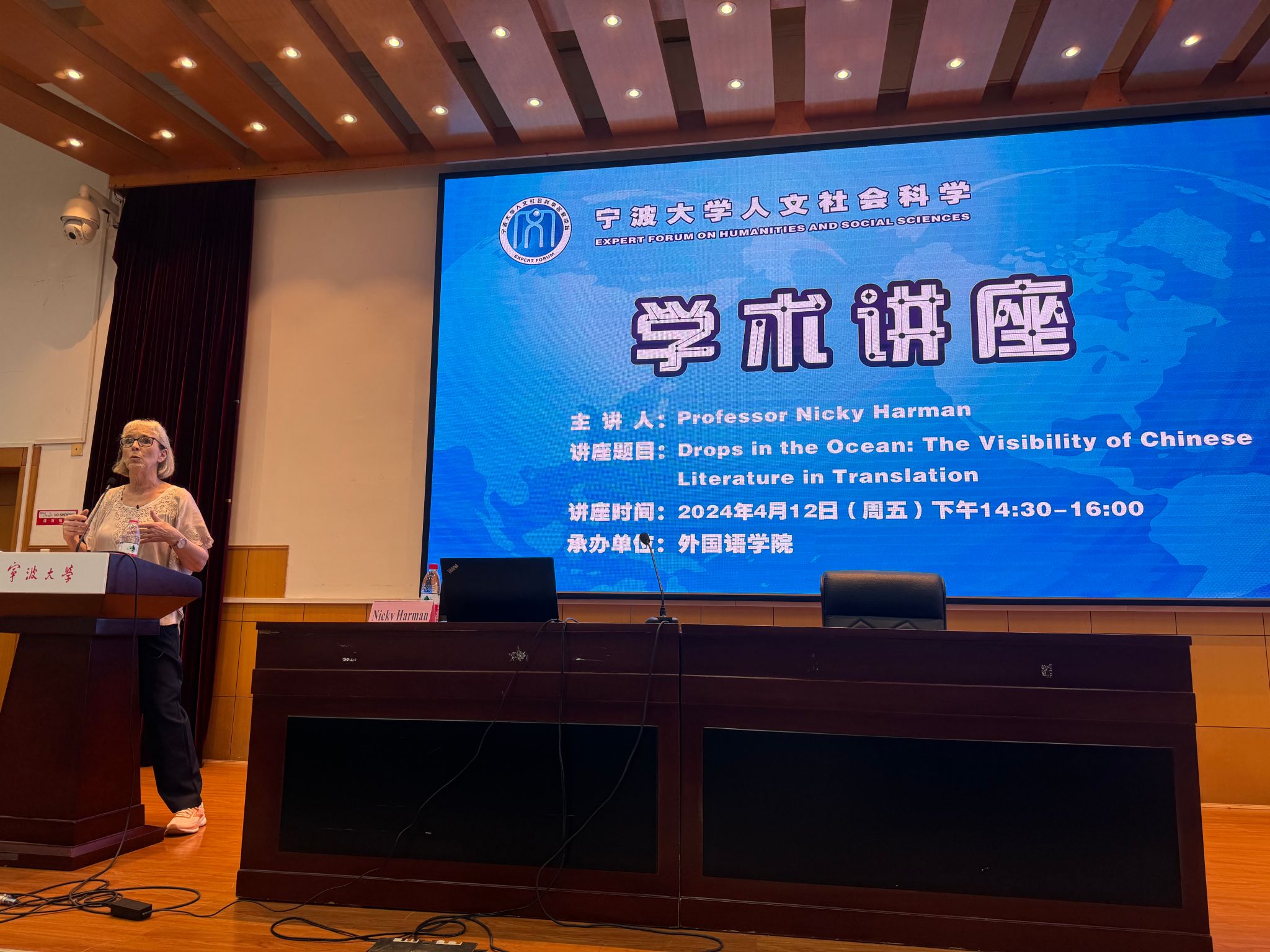 师生做题为“Drops in the Ocean: The Visibility of Chinese Literature in Translation”的线下讲座。本次讲座由徐赛颖副教授主持,学院师生百余人参加了此次讲座。