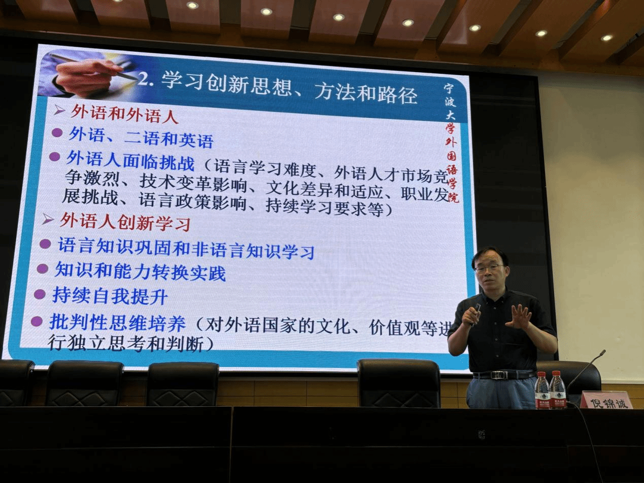 倪锦诚教授在本次讲座中详尽地阐述了自己长达二十载的外语学习与教学历程,以及十九年来在教学与科研领域所积累的励志经验。他通过深入浅出的方式,全面剖析了外语学习与科研创新的核心思想、科学方法及实践路径。倪教授特别强调,创新学习应当注重语言知识的巩固与拓展,同时不能忽视非语言知识的学习;此外,还需将所学知识与能力转化为实践应用,并持续进行自我提升;最后,培养批判性思维对于外语学习与科研创新同样至关重要。
