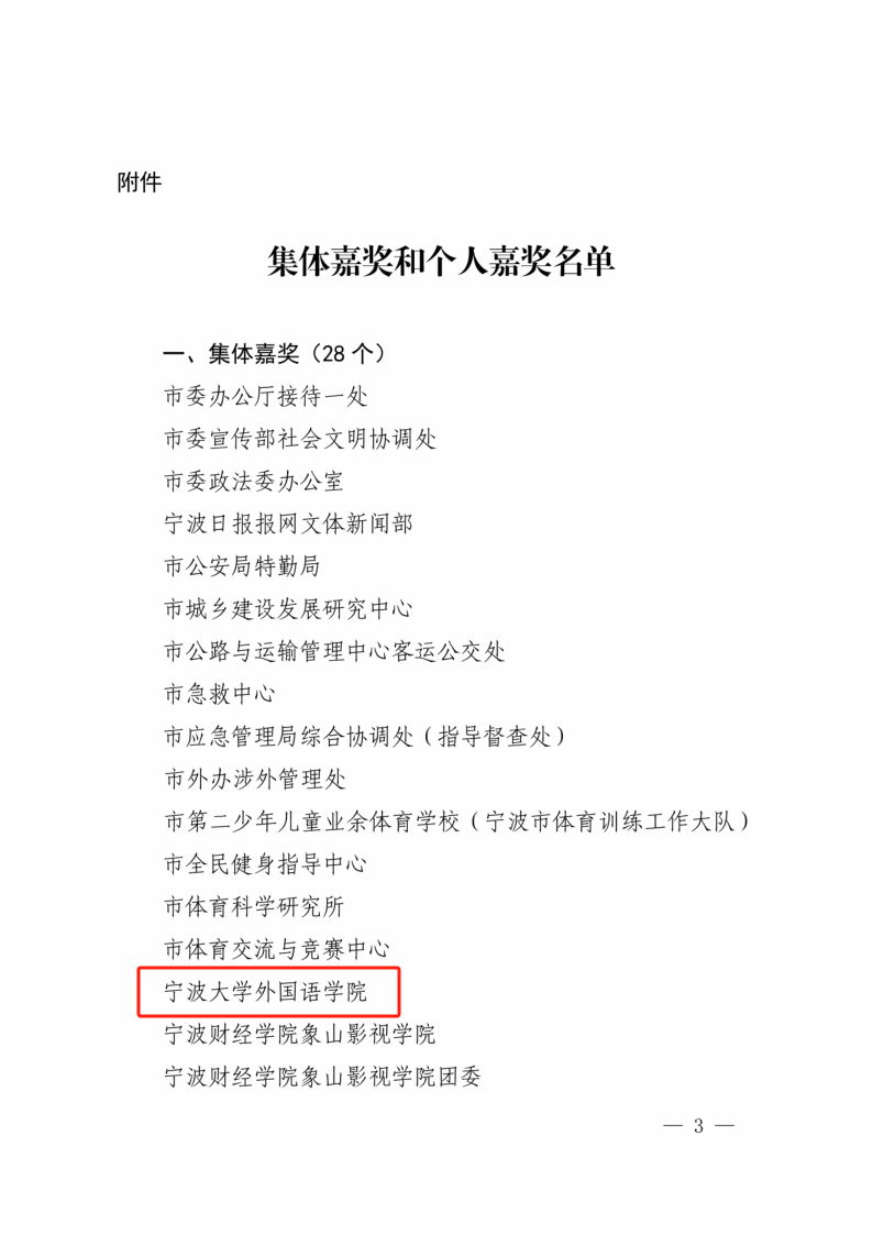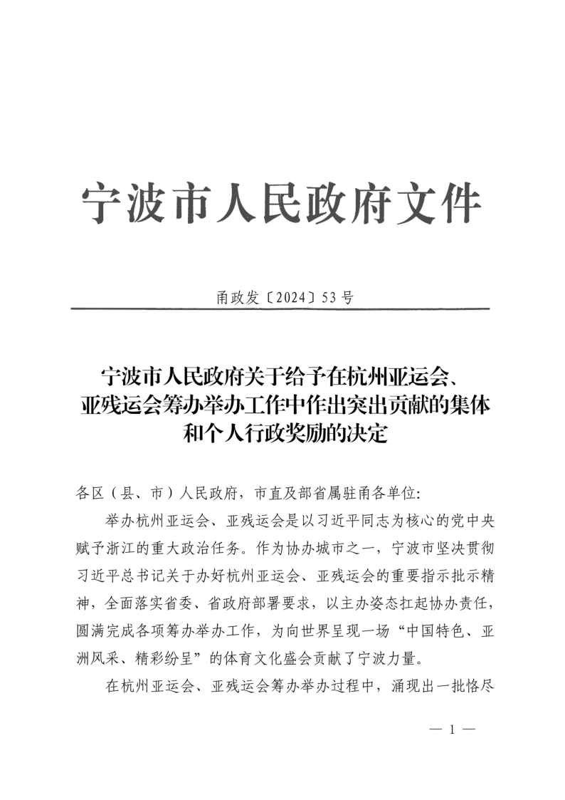 6月29日,宁波市人民政府发布《关于给予在杭州亚运会、亚残运会筹办举办工作中作出突出贡献的集体和个人行政奖励的决定》,对在杭州亚运会、亚残运会筹办举办过程中涌现出的恪尽职守、无私奉献的28个集体和84名个人给予嘉奖。爱下电子书