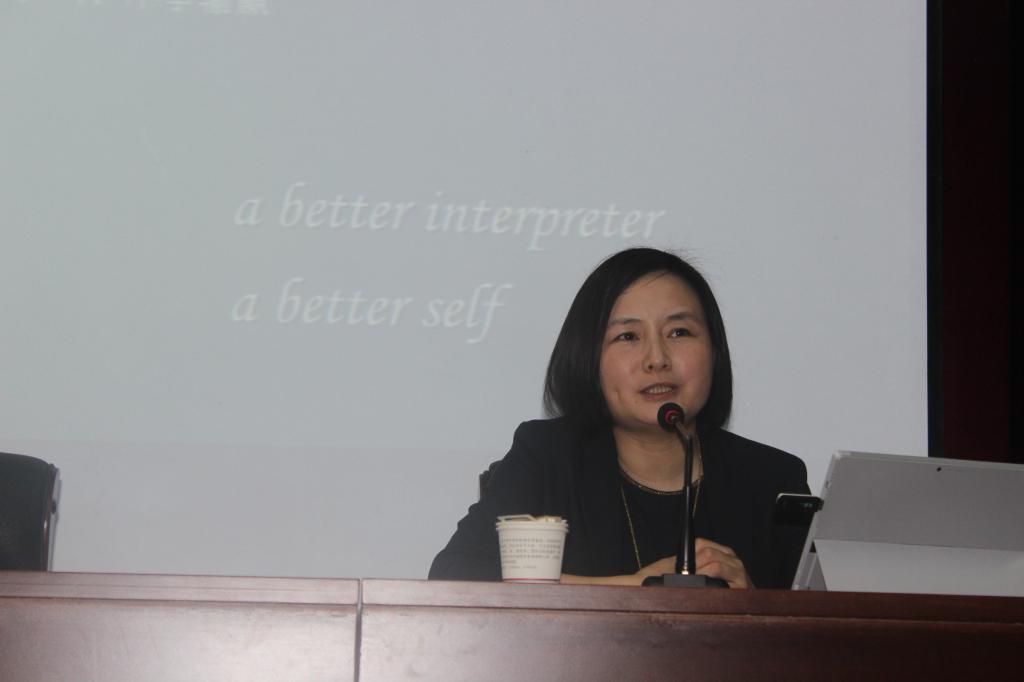 讲座伊始,戴虹开门见山介绍了自己,以二十年的翻译匠人身份,从自身体验出发,讲了中西思维和中西文化的差异,深入浅出的介绍如何才能成为一位合格的译员。她从一位职业译员的要求出发,通过列举和对照大量译例和亲身经历,从过硬的双语功底、广博的学识、娴熟的表达技巧、良好的身体和心理素质、良好的职业道德这些方面分享自己的经历,内容丰富,引人入胜。没有1万小时的训练,成就不了一个译员,“工欲善其事,必先利其器”。